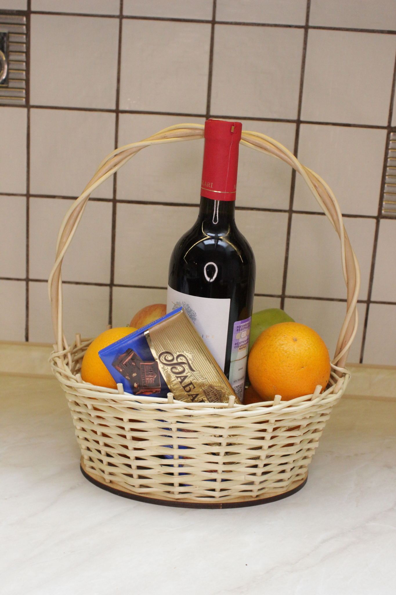 Корзина имеет фанерное дно и подходит для нетяжелых предметов. Наполнив самостоятельно корзинку фруктами, цветами или например, аксессуарами для ванны, подарок будет запоминающимся и станет украшением праздника. А получатель в последствии может использовать эту корзинку для декора своего интерьера.