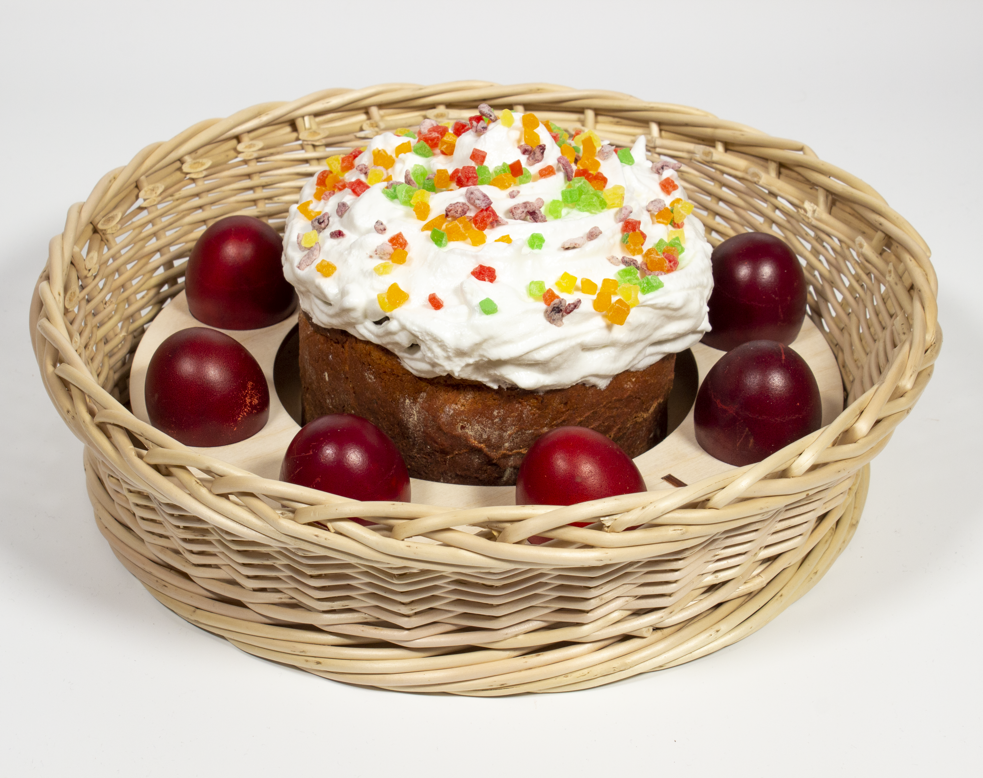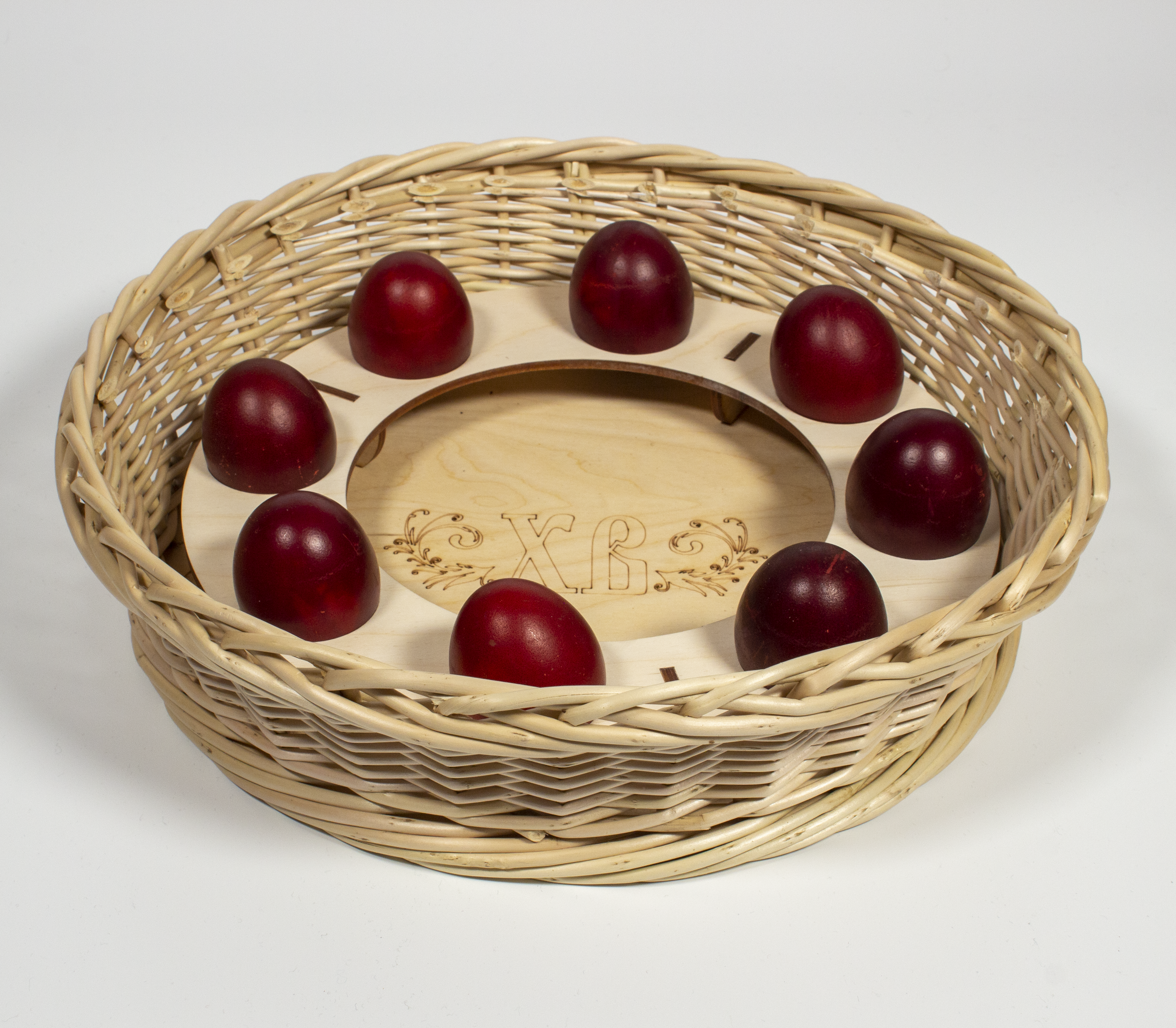 Пасхальное блюдо из ивовой лозы имеет фанерное дно. На дне выгравирована символика праздника: буквы ХВ. К блюду прилагается деревянный вкладыш - подставка для кулича и 8 яиц. Его можно использовать как в корзине, так и вытащить и использовать отдельно.