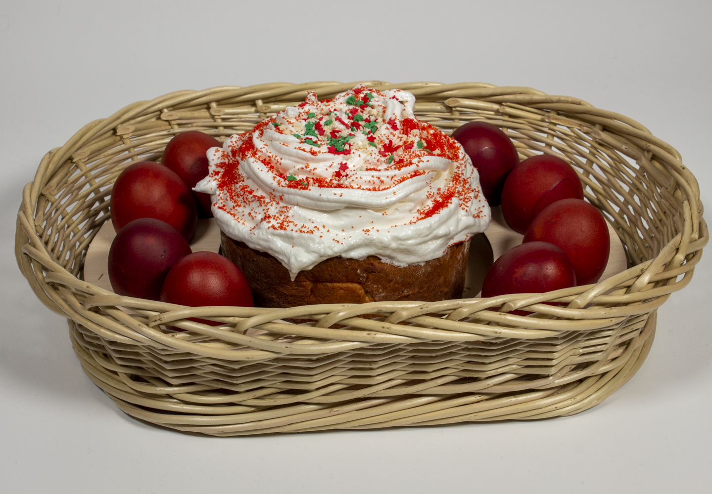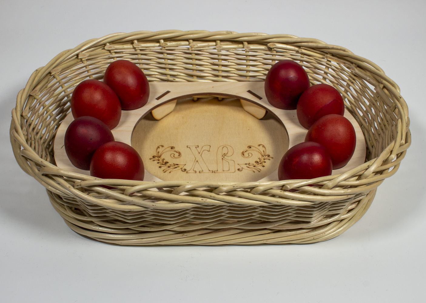 Пасхальное блюдо из ивовой лозы имеет фанерное дно. На дне выгравирована символика праздника: буквы ХВ. К блюду прилагается деревянный вкладыш - подставка для кулича и 8 яиц. Его можно использовать как в корзине, так и вытащить и использовать отдельно.
